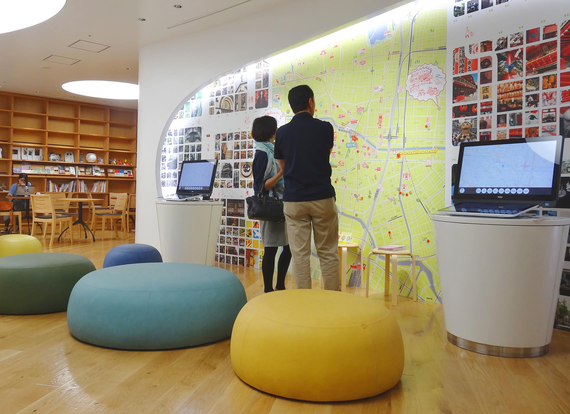 御茶ノ水ソラシティの一角にある「お茶ナビゲート」は、文化と歴史の薫る街「お茶の水」とその周辺エリアをナビゲートする“情報の泉”です。オリジナル散歩地図を作るプロムナードシステムや、古地図と古写真を多角的に閲覧できる歴史ギャラリーを常設し、連想を刺激する書棚コーナーとともに、これからの地域情報拠点のコンセプトを提案しています。