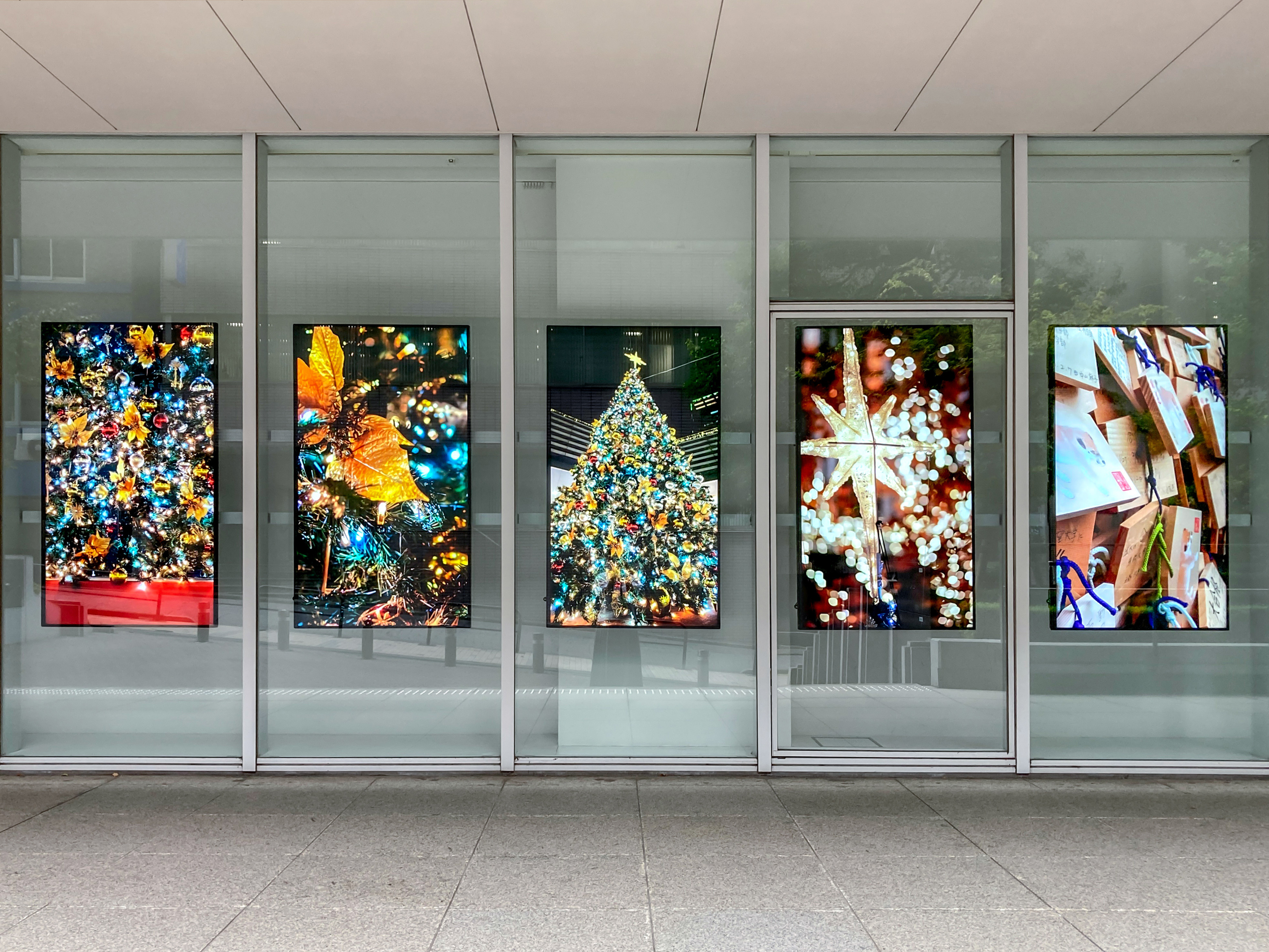御茶ノ水ソラシティプラザから、隣接するワテラスへと続く幽霊坂沿いの長く開放的な遊歩道に、デジタルアートギャラリー「KS46Wall」モニターゾーンが設置されています。60インチの大型ディスプレイが27台ずらりと並んだギャラリーは、季節ごとの映像演出や、様々な個展作品の展示で訪れた人の感性を刺激します。