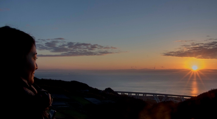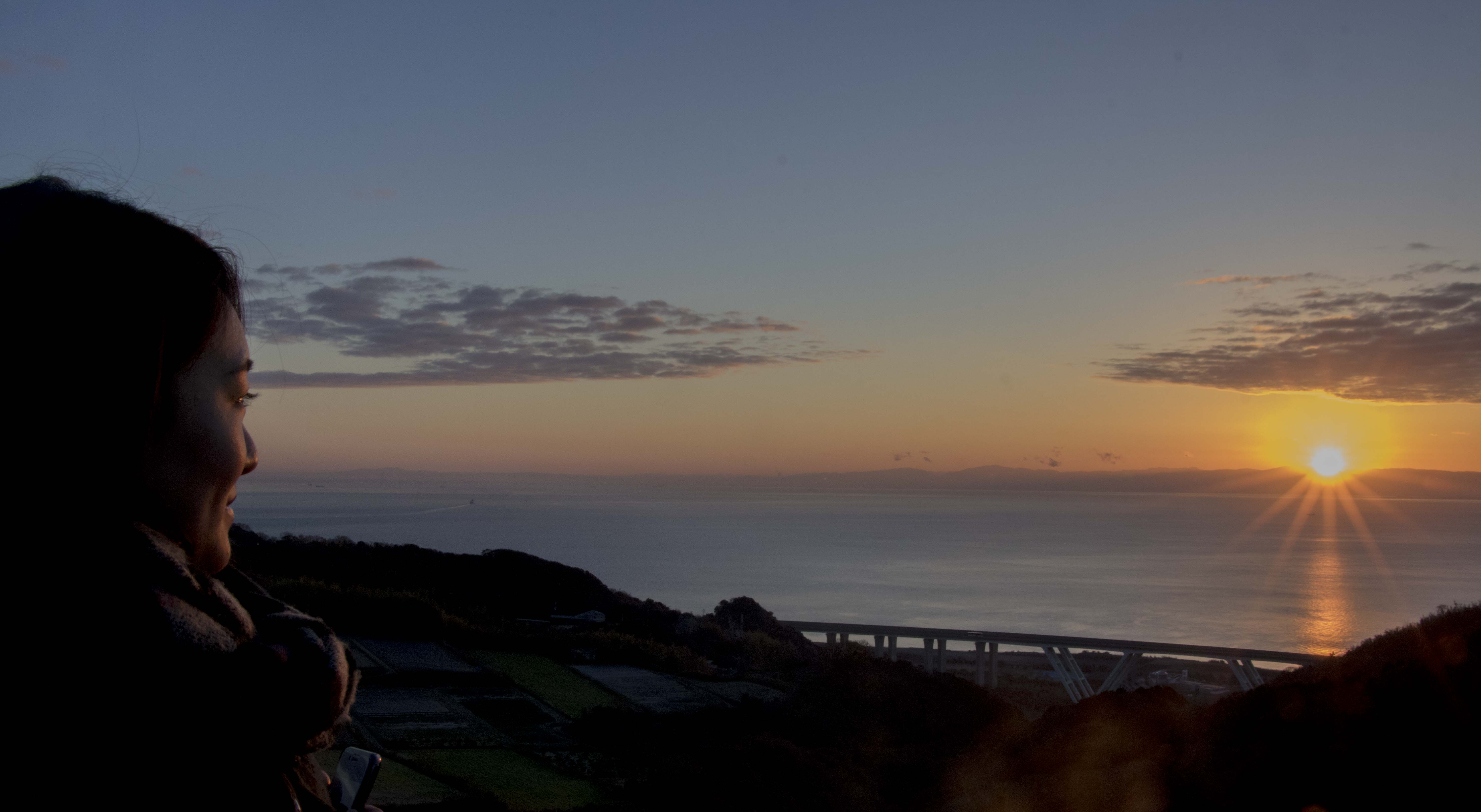 カイロで暖をとりながら、明石海峡大橋や大阪湾を見下ろす展望台からの、初日の出鑑賞