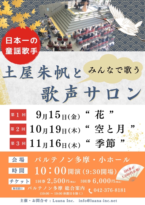 Luana合同会社主催、『土屋朱帆とみんなで歌う『歌声サロン』第2回“空と月”』が2023年10月19日 (木)にパルテノン多摩 小ホール(東京都多摩市落合2-35)にて上演されます。