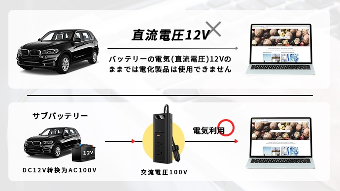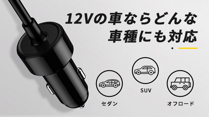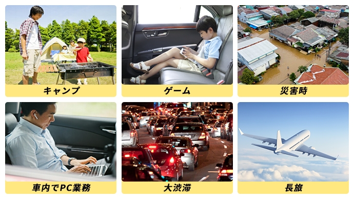 12Vの車なら全部対応できるシガーソケットを搭載しており、車種を選ばず使えます。車中泊、キャンプ、長距離ドライブなどはもちろん、運転手以外の方のクルマライフにも便利です。また、災害や停電などで電気が使えない時にも大活躍します。