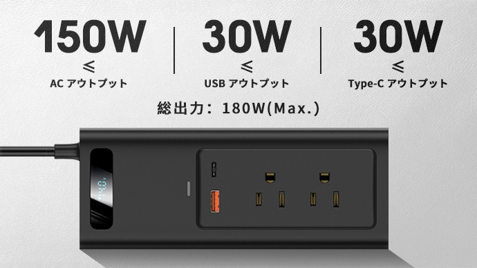 ACの出力は最大150W!USB充電ポート、Type-C充電ポートの出力は最大30W!日常生活の充電は十分!