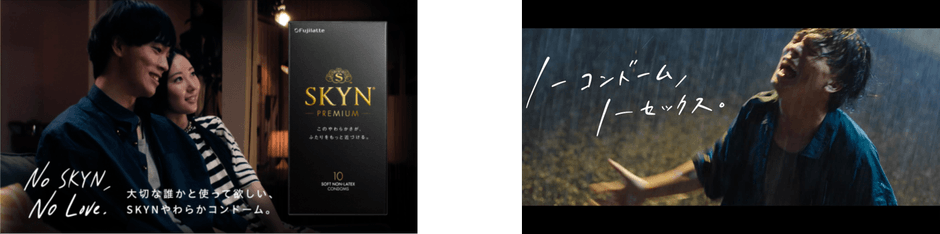 やっとの思いで目的地に到着するもそこには「閉店」の看板が。最後はもしSKYNを常備していたらという設定。「SKYNがなければ、Loveもない」「このやわらかさが、ふたりをひとつにする。」のメッセージ。