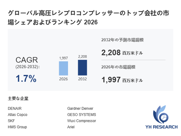 YHResearch調査チームの最新レポート「グローバル高圧レシプロコンプレッサーのトップ会社の市場シェアおよびランキング 2026」によると、2026年の1997百万米ドルから2032年には2208百万米ドルに成長し、2026年から2032年の間にCAGRは1.7%になると予測されています。