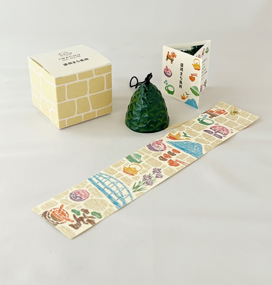 南部鉄器は南部藩(盛岡城)の歴史とともに大切に受け継がれてきました。今も盛岡の街を見守る盛岡城跡公園の石垣や盛岡にまつわるモチーフをいっぱいに詰め込んだデザインの短冊と、伝統の南部鉄器の風鈴が織りなす涼やかな音色をお楽しみください。