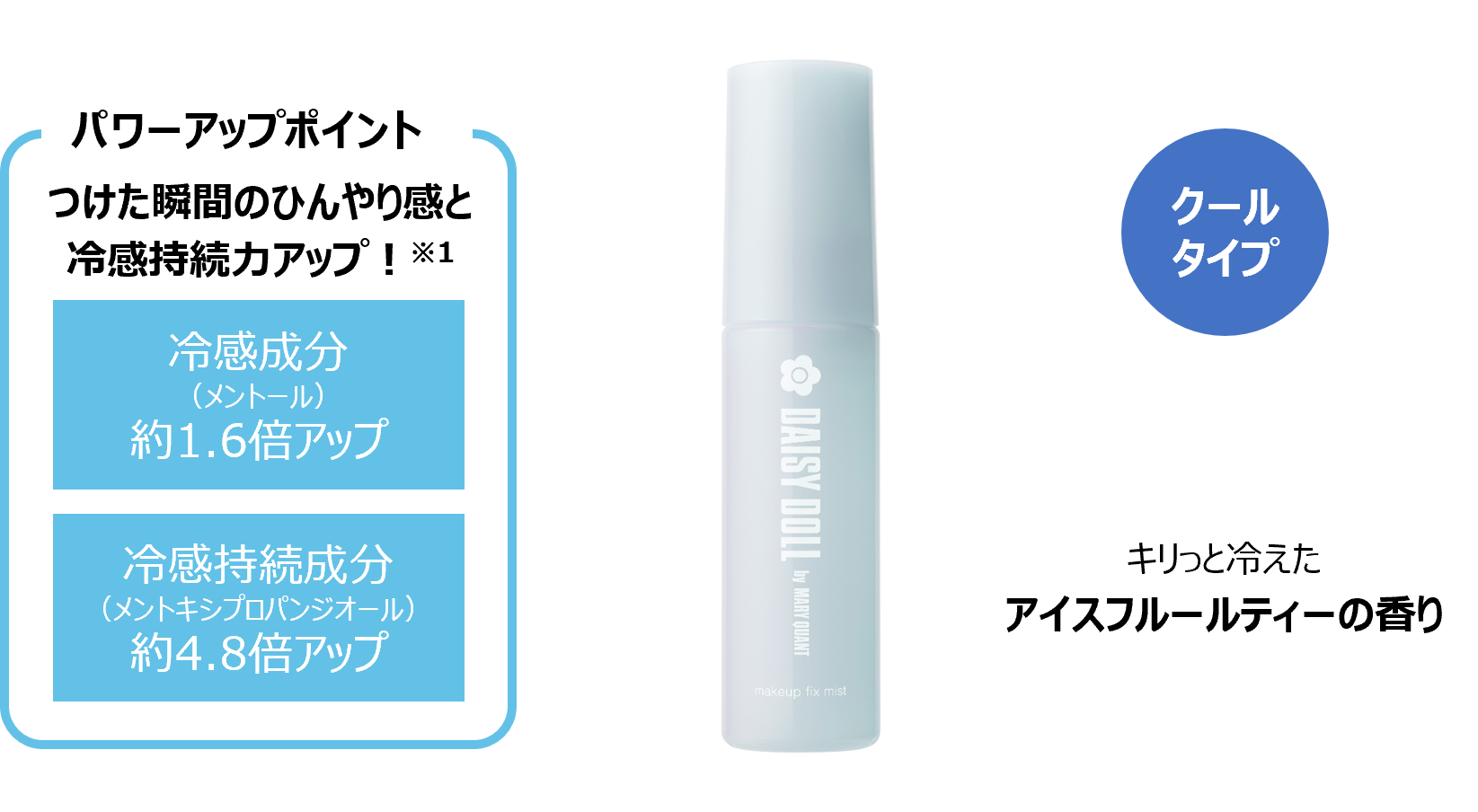 デイジードール メイクアップ フィックス ミストは2022年の発売以来、細かいミストが気持ちいい、メイクが崩れないと多くの支持を集めており、2025年に発売したクールタイプも暑い季節に快適に使えると嬉しい声をいただいております。今回の限定品は冷感効果がさらにパワーアップし、汗や水、皮脂などによる化粧崩れも防ぎます。キリっと引きしまるアイスフルールティーの香りで、暑い夏でもすっきりリフレッシュできます。