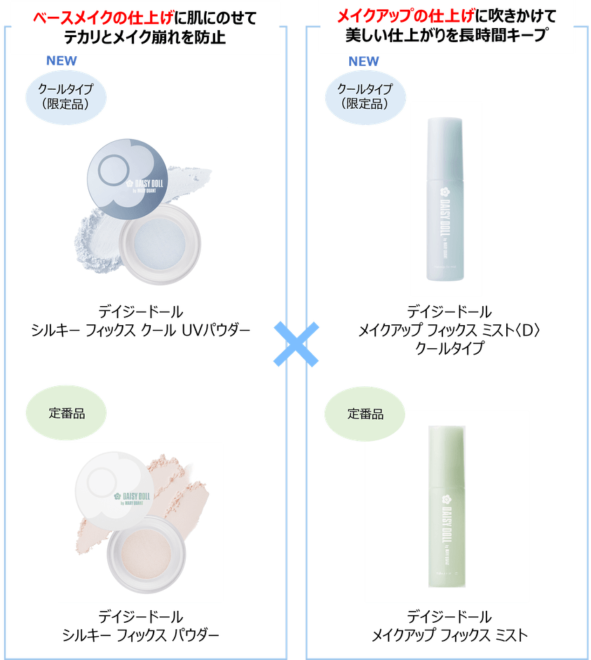 株式会社クラブコスメチックス(本社・大阪市 代表取締役:中山ユカリ)は、 DAISY DOLL by MARY QUANTより、夏のメイクを快適にする2つの冷感アイテム、「デイジードール メイクアップ フィックス ミスト〈D〉 クールタイプ」と「デイジードール シルキー フィックス クール UVパウダー」を、2026年4月15日に数量限定発売いたします。