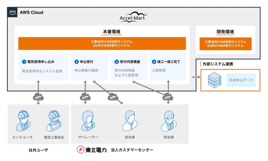 東北電力は、社会インフラとして重要な役割を担う電力の発電事業および電力小売事業に加え、昨今ではスマート社会の実現に向け、地域の成長・貢献に寄り添う多様なサービスの拡充に注力しています。同社の販売カンパニー法人営業部においては、法人顧客への電力販売に加え、顧客が抱える課題を解決する各種ソリューションサービスを提供し、その推進のためにデジタル技術の活用によるDXに取り組んでいます。法人顧客からの高圧電力以上の電気使用の申し込みは、およそ2,300の電気工事会社から年間6,000件近くあり、従来は受付窓口がある東北6県および新潟県の支店・営業所で紙の申込書によって受付していましたが、電気工事会社が受付窓口まで来店する移動時間および営業時間の制限による不便さや、記載内容の不備に因る手戻りも多く、顧客接点のデジタル化による改善を課題としていました。そこで、いつでもどこからでも申込みが可能なWebシステムの導入を検討し、ローコード開発により素早くシステム構築が可能なプラットフォームとしてintra-martを採用しました。