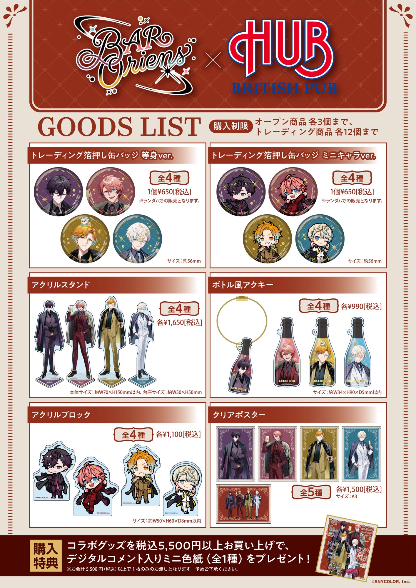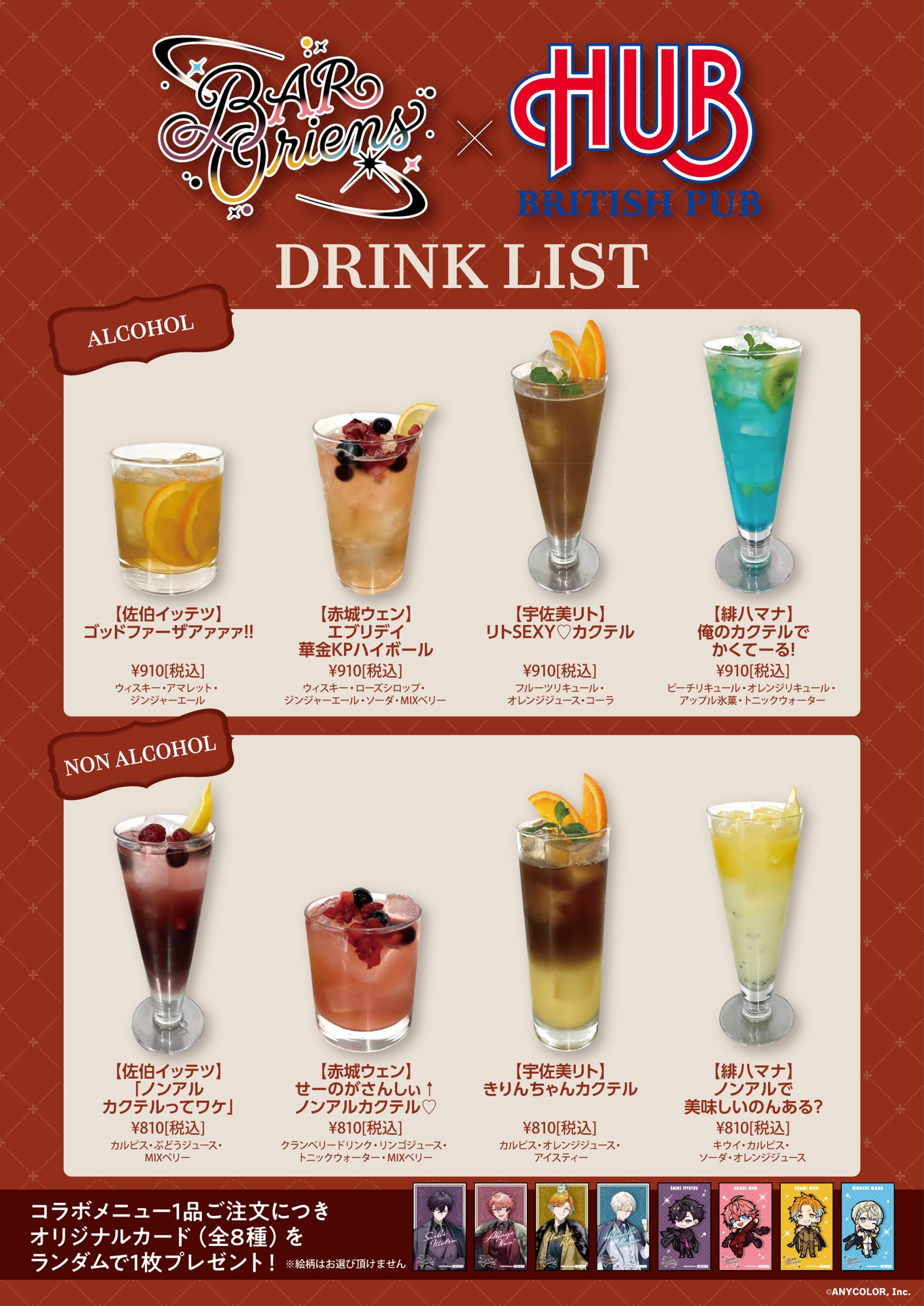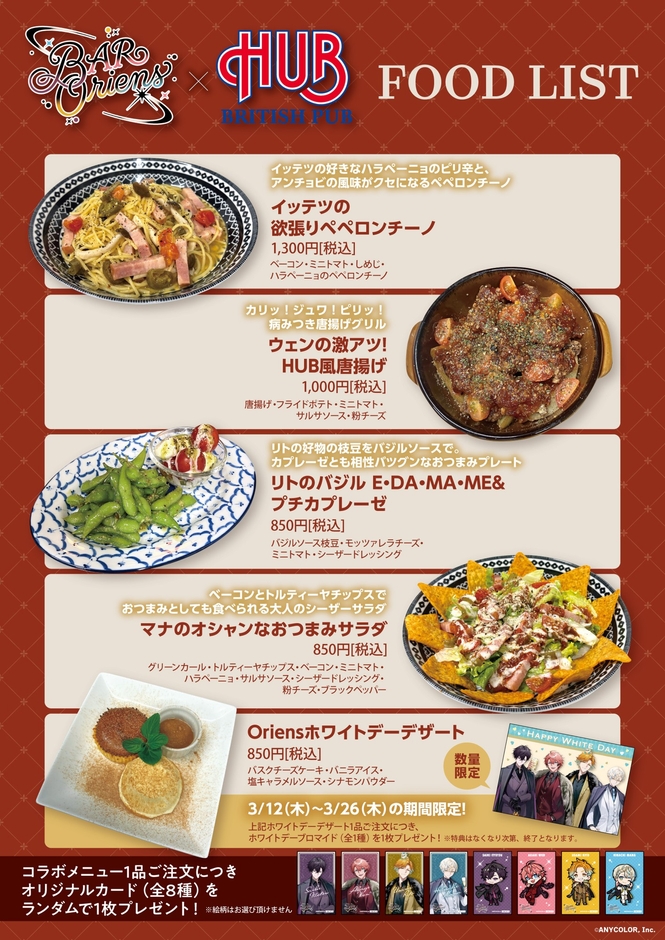 にじさんじ所属のユニット「Oriens」をイメージしたHUBオリジナルコラボメニューの販売、新規撮り下ろし等身パネルの展示・グッズ販売など、盛りだくさんの内容をお楽しみください。