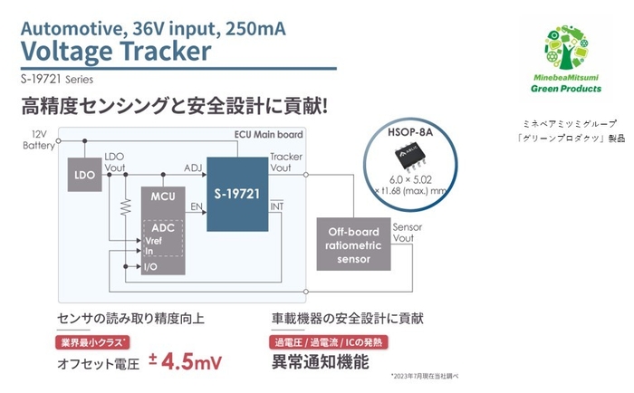 ミネベアミツミグループのエイブリック株式会社(社長: 田中 誠司、本社:東京都港区、以下:ABLIC)は本日より、車載用ボルテージトラッカ「S-19721 シリーズ」の販売を開始しました。