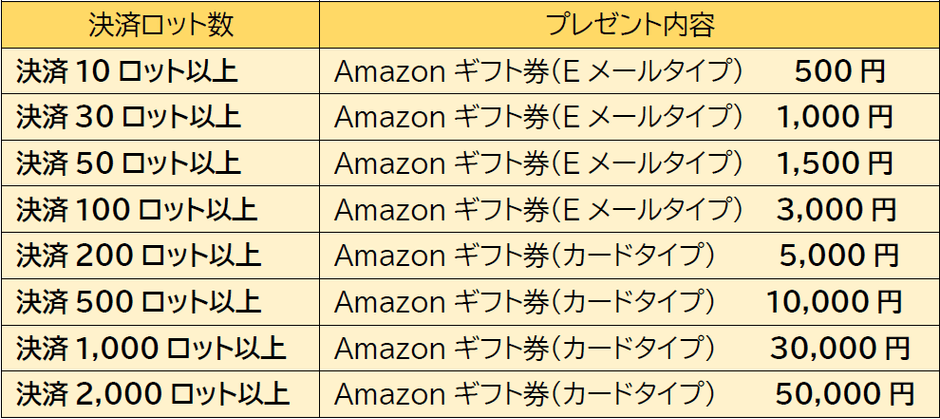 期間中の決済取引ロット数に応じて、Amazonギフト券(最大5万円)をもれなくプレゼント、更に、抽選で50名様に、ギフトパッドの「カレーのWEBカタログギフト 5千円相当」をプレゼントいたします。