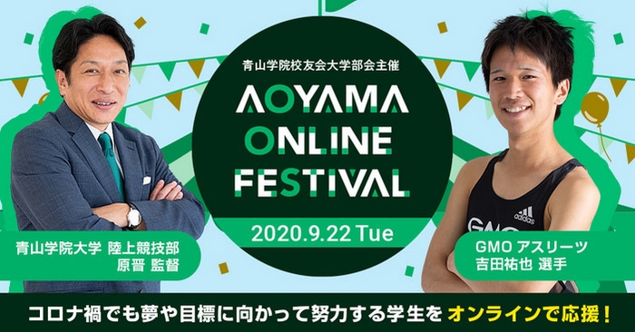 陸上競技部・原晋監督が登壇。OBのGMOインターネットグループの吉田 祐也選手(2020年箱根駅伝で第4区区間新記録、初マラソン日本歴代2位をマーク)を招き、コロナ禍でも夢や目標に向かう学生を応援します。司会は木佐 彩子さん(英米文学科卒)。夜間にはアーカイブ(録画)でご覧いただけます。