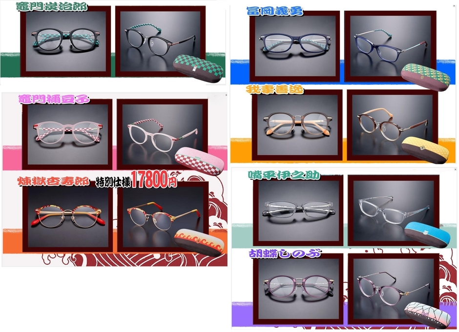 竈門炭治郎、竈門禰豆子、我妻善逸、嘴平伊之助、冨岡義勇、胡蝶しのぶ、煉獄杏寿郎をイメージしたメガネです。