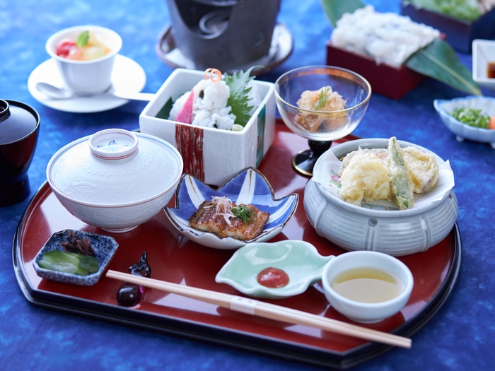 淡路島産の新鮮な鱧を南蛮漬けや天婦羅、鱧ご飯など多彩な調理法で鱧の繊細な味わいを堪能できる御膳です。特に「鱧の落とし」はさっぱりとした梅肉ソースが鱧の旨味を引き立て、暑い夏にぴったりの涼やかな御膳です。