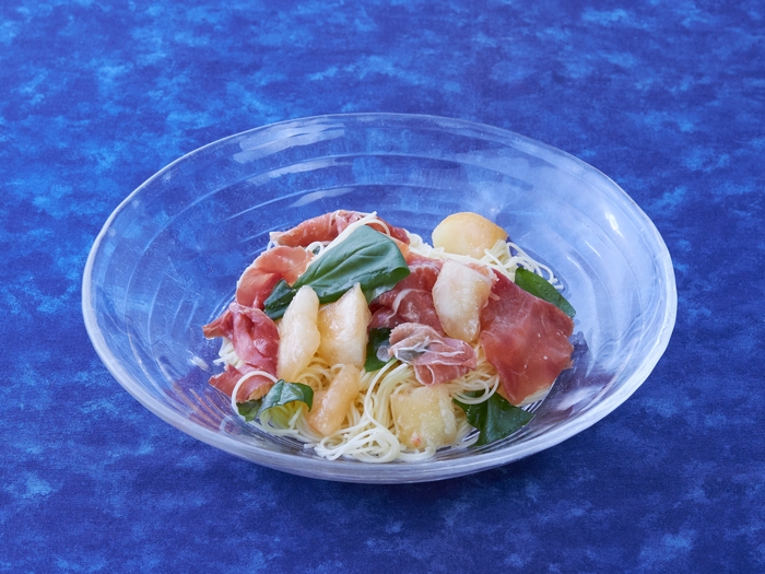 桃と生ハム、バジルの冷製カッペリーニ:ランチタイム2,300円(ランチビュッフェ付き)、ディナー(アラカルト)1,650円 ※税込
