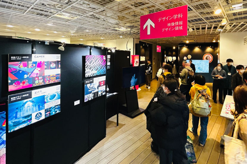 デザイン学科及びデザインメディア領域では、3号館地下1階から3階までを使用し、グラフィックデザイン、イラストレーション、映像情報デザイン、空間プロダクトデザインの4つの領域に分かれて、展示が行われます。学生たちが学びの集大成として、広告デザイン、ブランディングデザイン、イラストレーション、映像デザイン、インタラクションデザイン、UI/UXデザイン、空間デザインやプロダクトデザインなど、個々の視点から表現した作品が展示されます。