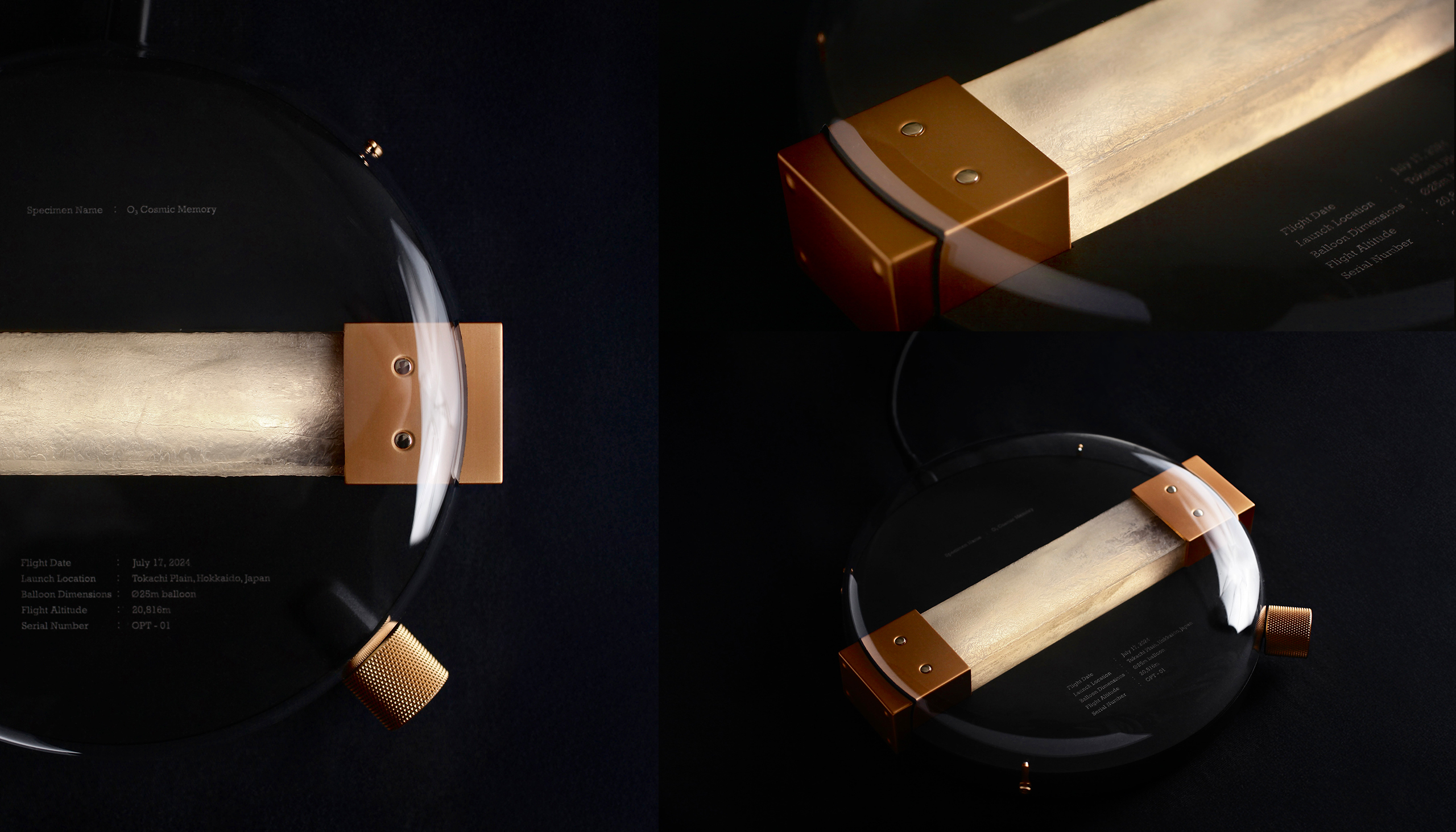 その膜素材を、「宇宙の入り口」に触れた記憶を宿す貴重なマテリアルと捉え、標本のように保管・鑑賞するための照明彫刻として再構築している。