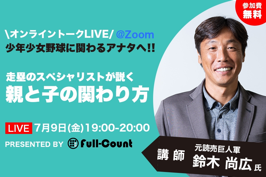 株式会社Creative2(代表取締役:石倉勇、佐藤岳)が運営するベースボール専門メディアFull-Count(https://full-count.jp/)は、元読売ジャイアンツの鈴木尚広さんをお招きし、野球に励む少年少女と保護者、指導者の関わり方について考えるオンライントークイベント「走塁のスペシャリストが説く親と子の関わり方」を2021年7月9日(金)に開催します。参加者をFull-Count公式サイト(https://full-count.jp/seminar04-2/)にて募集中です。