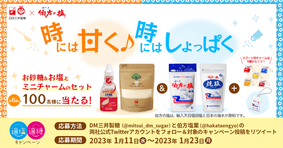 創業50周年を迎えた「は・か・た・の・しお♪」のTVCMが印象的な伯方塩業株式会社(本社:愛媛県松山市 代表取締役社長:石丸 一三)と、「スプーン印」「ばら印」のお砂糖でおなじみのDM三井製糖株式会社(本社:東京都中央区 代表取締役社長:森本 卓)が昨年に引き続き「適塩適糖キャンペーン2023」を開催いたします。第1弾となるTwitterキャンペーンは、2023年1月11日(水)塩の日からスタート!抽選で100名様に、お塩とお砂糖セットが当たります。