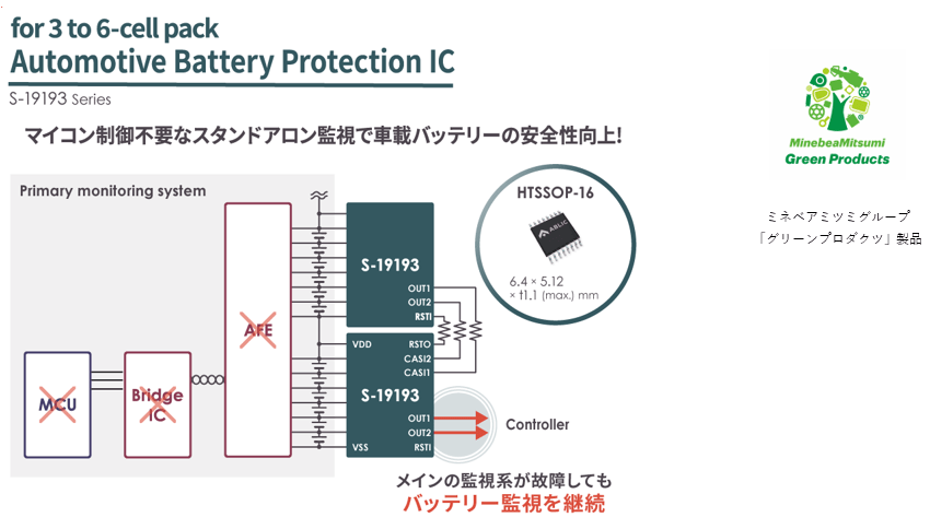 ミネベアミツミグループのエイブリック株式会社(社長:田中 誠司、本社:東京都港区、以下:ABLIC)は本日より、車載用3~6セルバッテリー監視IC「S-19193シリーズ」の販売を開始しました。