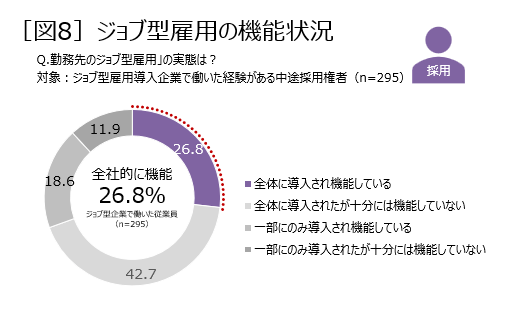 ジョブ型雇用導入企業の約7割で全社的に導入されているが、「十分に機能している」のは26.8%