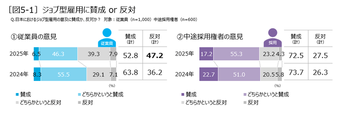 日本でのジョブ型雇用が普及することについて賛成か反対か、従業員1,000人と中途採用権者600人に聞きました。