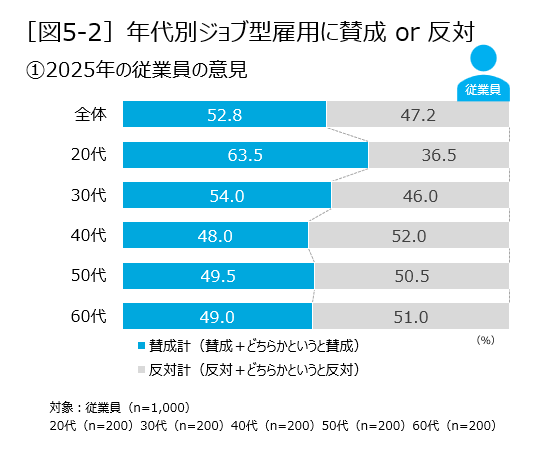 若い年代はジョブ型雇用に「賛成」が多いが、40代以上では「反対」の割合が半数超