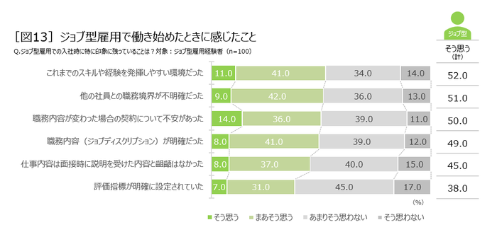 ジョブ型雇用で働き始めたときに感じることは、「スキルを発揮しやすい環境」と良い印象の一方で 「職務境界が不明確」「契約に対する不安」など不安が半々