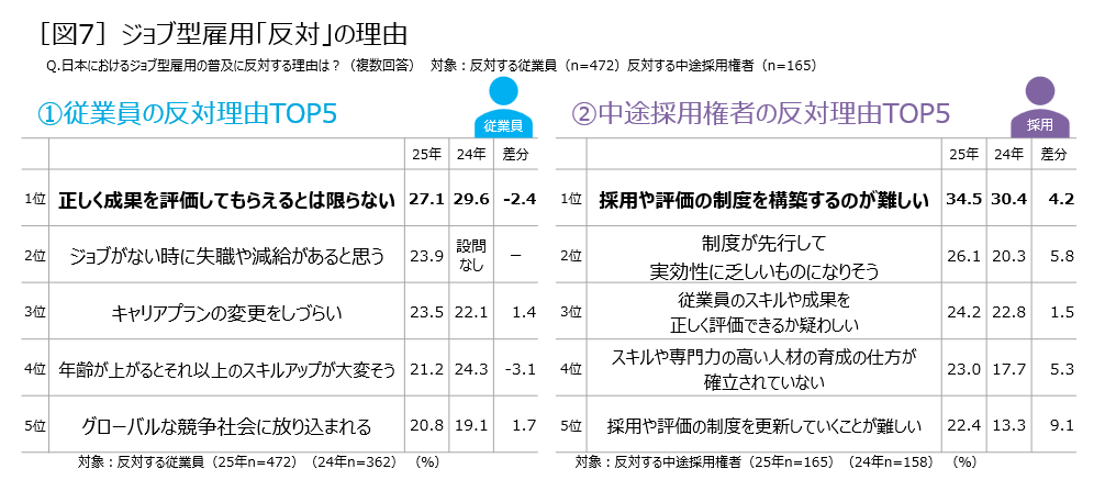 日本でのジョブ型雇用の普及に「反対」と答えた従業員472人に反対の理由を聞くと、「正しく成果を評価してもらえるとは限らない」(27.1%)、「ジョブがない時に失職や減給があると思う」(23.9%)、「キャリアプランの変更をしづらい」(23.5%)が上位に挙げられました。中途採用権者165人の反対理由は、「採用や評価の制度を構築するのが難しい」(34.5%)、「制度が先行して実効性に乏しいものになりそう」(26.1%)、「従業員のスキルや成果を正しく評価できるか疑わしい」(24.2%)となり、2位の「実効性に乏しい」は前回(20.3%)より5.8ポイント増えています[図7]。