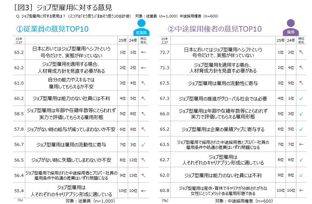 この2つに次いで、従業員側は「自分の能力やスキルでは雇用してもらえるか不安」(61.0%)、「ジョブ型雇用は能力のない社員には不利」(60.2%)と不安が高いのに対し、中途採用権者側は「ジョブ型雇用は雇用の流動性に寄与」(67.5%)、「ジョブ型雇用の推進がグローバル社会では必要」(67.3%)と評価する声が高くなっています[図3]。
