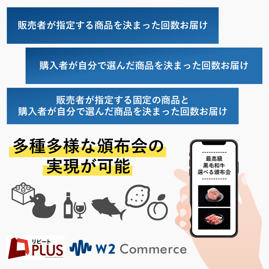 様々なビジネスサイズや商材カテゴリを幅広く対応する高機能ECプラットフォームを提供するw2ソリューション株式会社(本社:東京都中央区、代表取締役CEO:山田 大樹)は、D2C定期通販ECサイトシステム「リピートPLUS」・オムニチャネル対応型総合ECサイトシステム「w2Commerce」に頒布会機能を追加しました。従来までカスタマイズで開発をしてきた頒布会機能を、今回の機能追加によりSaaS型リピートPLUS・SaaS型w2Commerceでもオプション機能としてご利用いただけます。通常の頒布会はもちろんのこと、機会・回数・商品を自由に設定ができます。また、頒布会機能のコンテンツ作成も簡単で、利用状況の分析機能も活用できる、多様な頒布会の実現が可能となります。