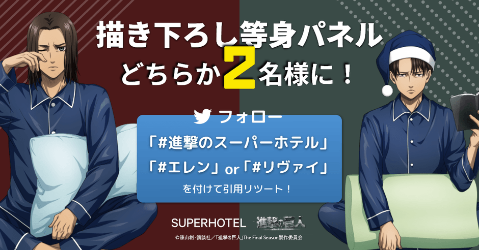 スーパーホテル TVアニメ『進撃の巨人』コラボ第2弾 描き下ろしキャラクターのパネルがもらえる SNSキャンペーンも開催