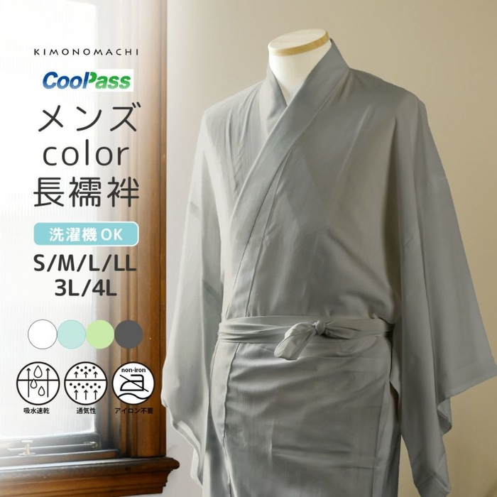 吸水速乾ポリエステル素材Coolpassの長襦袢、二部式襦袢、男性用長襦袢が登場。カラーは1.白 2.白藍 3.白緑 4.銀鼠の4色展開。暑い時期のインナーに、コーディネートのワンポイントにおすすめです。