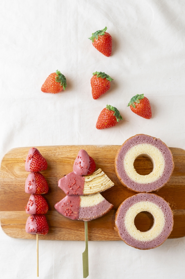 『伊豆・村の駅 伊豆のへそ店』で販売しているハードバウムクーヘン「天城輪道」と、「いちごのバウムクーヘン」のコラボレーション!2種のミニカットのバウムクーヘンといちごに、いちごチョコレートをつけました。1本で2種のバウムクーヘンが食べ比べできる、バウムクーヘン好きにおすすめなメニューです。