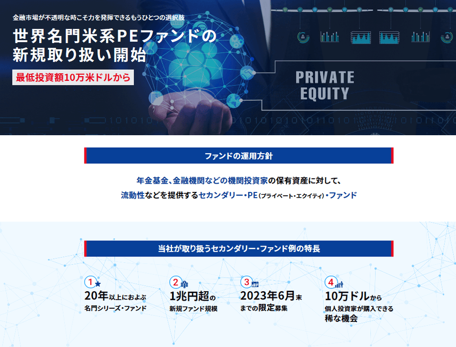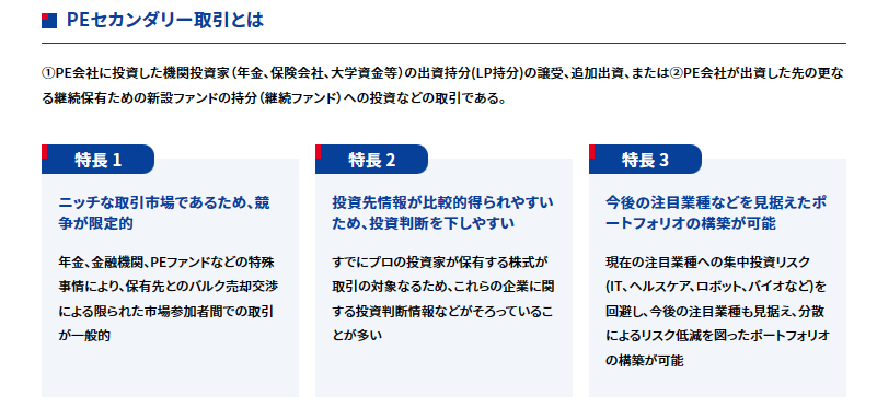特にセカンダリー(流通)市場で取引されるPEファンドの特長、過去の取引先抜粋例、世界の著名な大学基金や富裕層などが注目するセカンダリーPEファンド投資の魅力について、参考となる詳しい内容を提供しています。