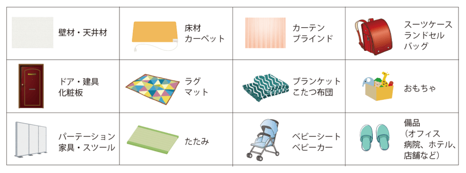 家具や建築材料、インテリア製品だけではなく、ランドセルやおもちゃ、ブランケットやスリッパといった生活用品など、何にでもその意匠を損なわずに塗布・施工ができるのが「メディカルナノコート」の特徴です。図に示したものはごく一部の例であり、お客様のご要望に応じて、さまざまなものを抗ウイルス・抗菌コーティングすることが可能です。