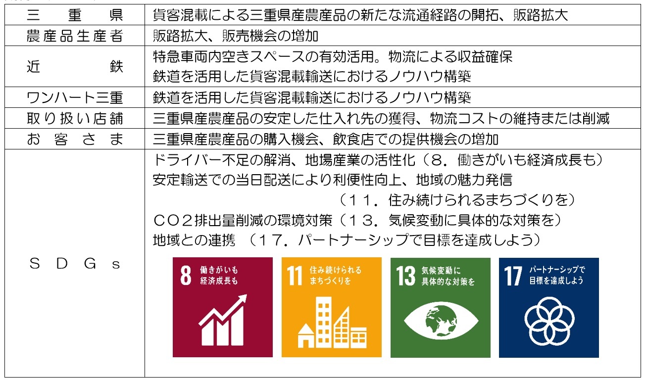 取り組み内容は、三重県内の農業従事者が生産した農産品をワンハート三重が集荷、近鉄の駅まで運搬し列車に積み込み、都心部の駅まで近鉄が運びます。駅到着後、ワンハート三重が積み降ろしを実施、駅近隣の販売店や飲食店まで運送し、各店舗での販売や食材として使用を実施します。
