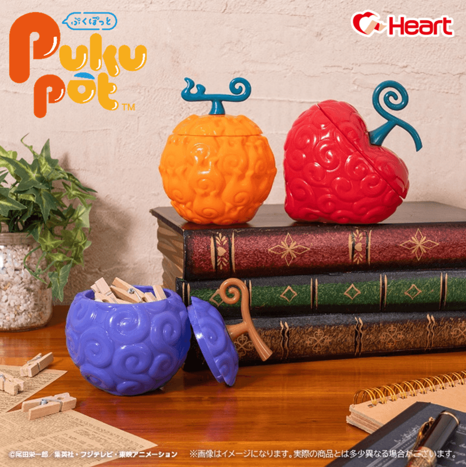 大人気アニメ「ONE PIECE」より、昨年に引き続き悪魔の実を再現したPukuPotが登場!作中に登場する悪魔の実より、「ゴムゴムの実」「オペオペの実」「メラメラの実」を立体化しました。表面の模様まで忠実に再現したまるで本物の悪魔の実の様なPukuPotは、お部屋のインテリアにもぴったりです。チョコを食べ終わった後はクリップなどの小物の収容にご使用いただけます。