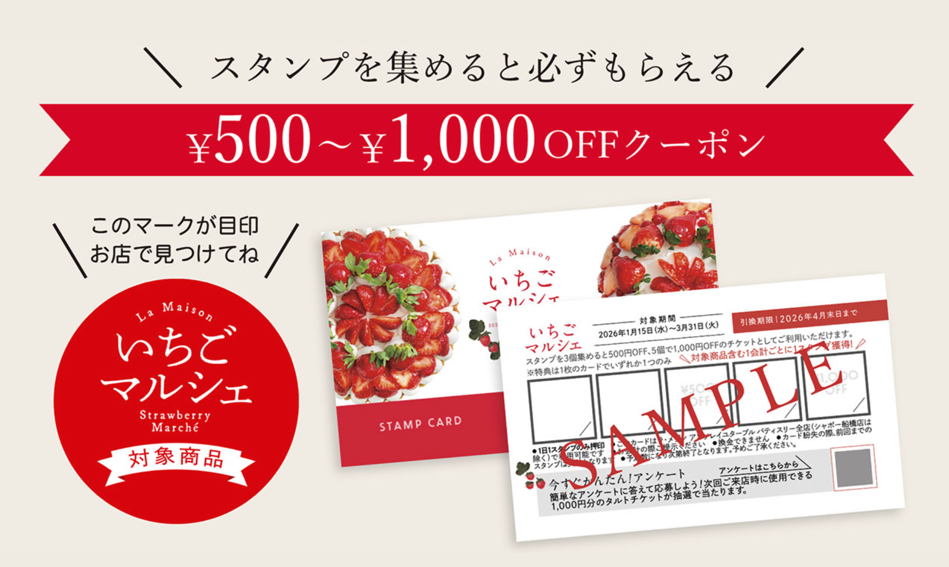 甘酸っぱいいちごのタルトが多数登場する『いちごマルシェ』と、クーポンがもらえるスタンプカードキャンペーンを実施します。