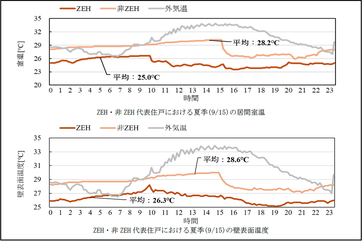 〈夏季〉夏季の代表日(9月15日)における居間室温、壁表面温度はともにZEHマンションの方が非ZEHマンションよりも一日を通して低く保たれていた。