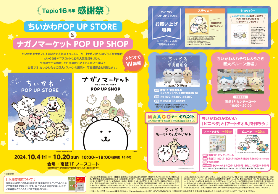 今年はちいかわやナガノのくまなどで人気のイラストレーター「ナガノ」さんのグッズが大集合するPOP UPを期間限定で開催します。ぬいぐるみやマスコットなどの人気商品をはじめ、かわいいアイテムが大集合!会場では、ちいかわたちの巨大バルーンの展示や、写真撮影会やワークショップも開催します。