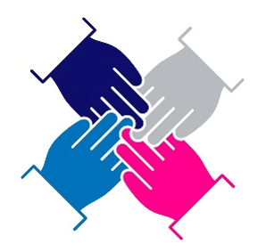 4つの手が中心に向かって重なり合う構成は、4社が手をつなげて共通の目標に向かって手を取り合う姿勢を象徴しています。