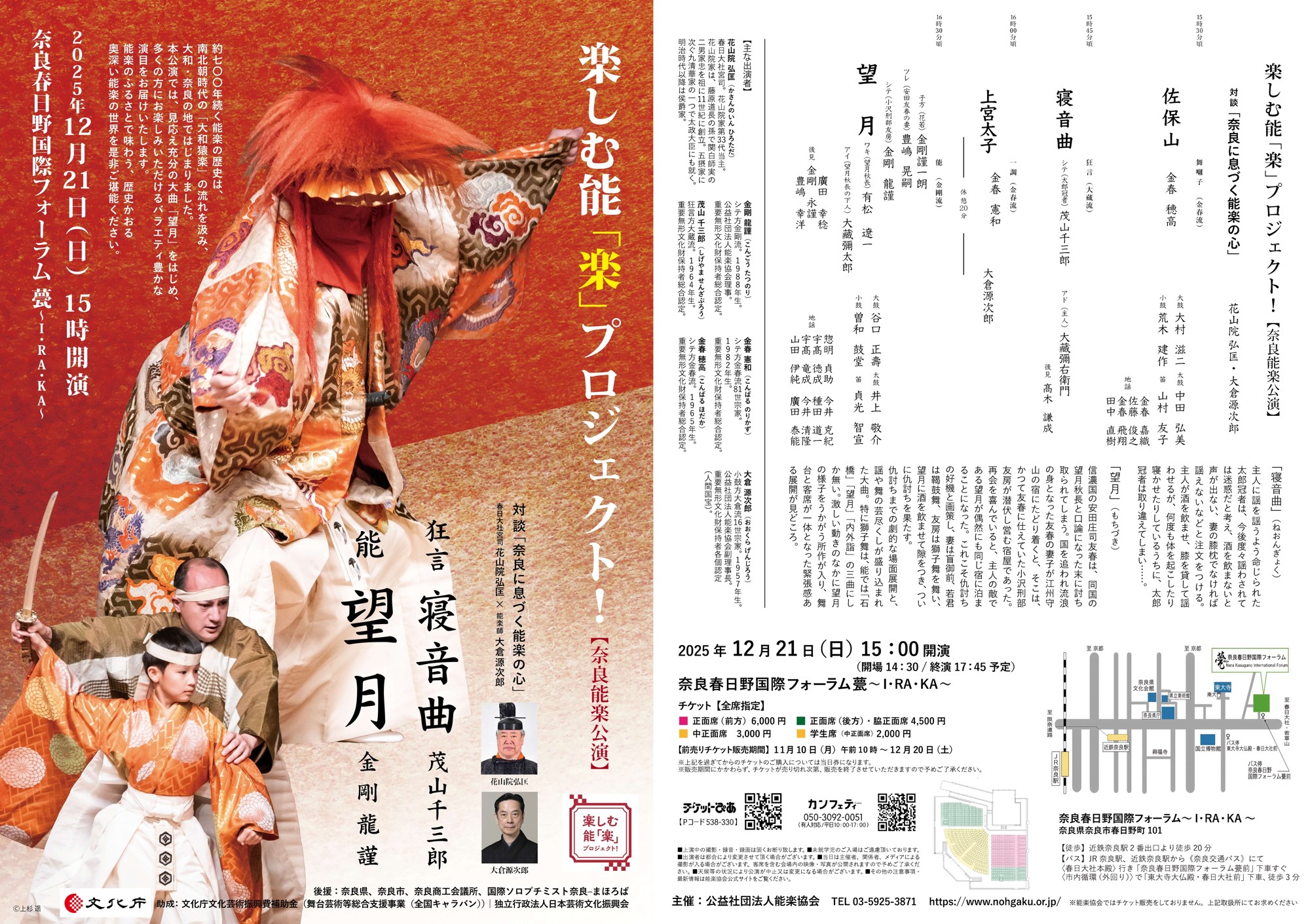 公益社団法人能楽協会主催、『楽しむ能「楽」プロジェクト! 奈良能楽公演』が2025年12月21日 (日)に奈良春日野国際フォーラム 甍~I・RA・KA~(奈良県奈良市春日野町101)にて上演されます。