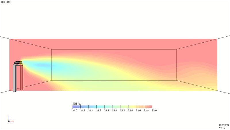 「AQUAミストゾーナー」の最大の特長は、ミストを「出す」だけでなく「送り届ける」という発想の転換にあります。微細なミスト粒子をパワフルなエアーで押し出すことで、風向きに応じた冷却エリアのコントロールが可能になりました。また、下向きに設定することでエアカーテンとしての活用も可能です。