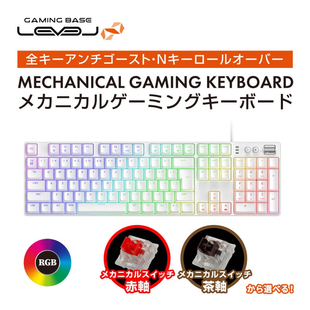 商品名:メカニカルゲーミングキーボード フルサイズ 日本語 茶軸 ホワイト ( LEVEL∞ LEV-KB01FK-JBR-WH )