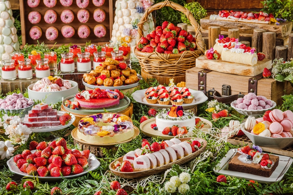 今年もフレッシュ苺が食べ放題なのはもちろん、春らしいスイーツのラインナップが目白押し。王道スイーツの「苺のショートケーキ」や「苺のロールケーキ」、見た目も華やかな「エディブルフラワーのリースケーキ」など、苺好きにはたまらないスイーツブッフェをご用意いたしました。