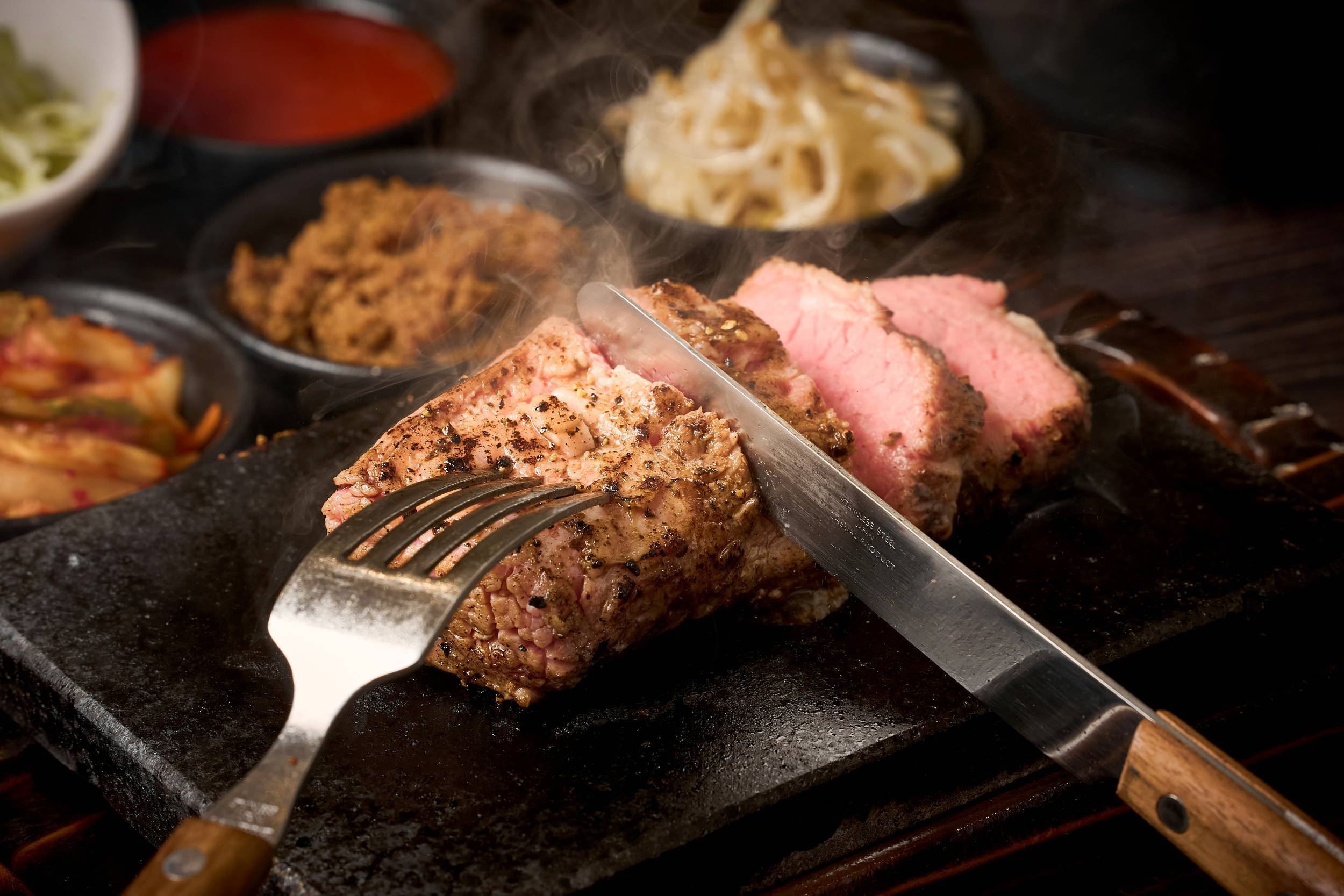 新しくオープンする「飽喰亭」では、企業独自の特別レシピ(真空調理)で驚くほど柔らかく仕上げたお肉を、こだわりの「溶岩プレート」に乗せてご提供いたします。