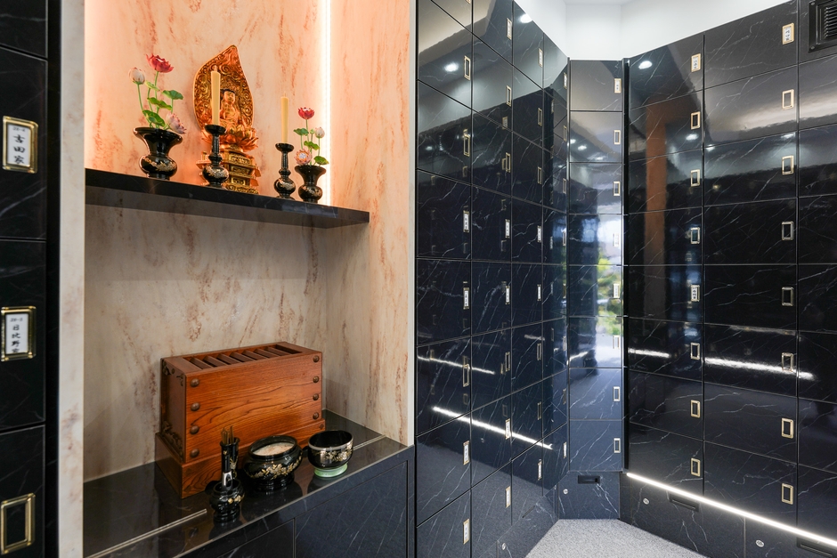 新しい納骨堂は美しい空間で遺族にとっても心地のよい場所です。仏壇式納骨堂となっており、宗派を問わず皆さまにご利用いただけるような仕様でございます。