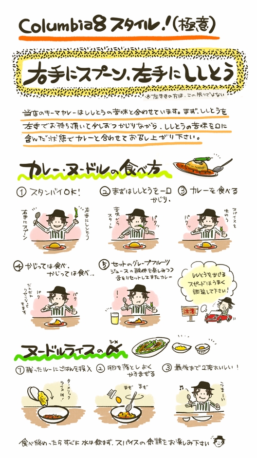 「コロンビアエイト」では、独創的かつ本格的な味わいのスパイスカレーを提供しています。スパイスカレーの香りと味を楽しむ為、トッピングのししとうを最初に味わい、ししとうの苦みと合わせてカレーを食べる、「右手にスプーン」「左手にししとう」という、独特な食事スタイルです。お店に足を運んでくださったお客様からは、「ししとうを主役として食べたのは初めて。」「一皿で色々な楽しみ方がありますね。」「キーマカレーの概念がいい意味で覆された。」「大阪の味が名古屋でも食べられるなんて・・・!」といった声が寄せられています。