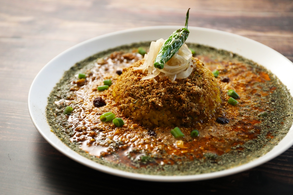 大阪市中央区で独創的かつ本格的な味わいの「スパイスカレー」を提供しています。スパイスカレーの香りと味を楽しむ為、トッピングのししとうを最初に味わい、ししとうの苦みと合わせてカレーを食べる、「右手にスプーン」「左手にししとう」という、独特な食事スタイルです。大阪の「レジェンドオブスパイスカレー」と呼ばれる名店です。